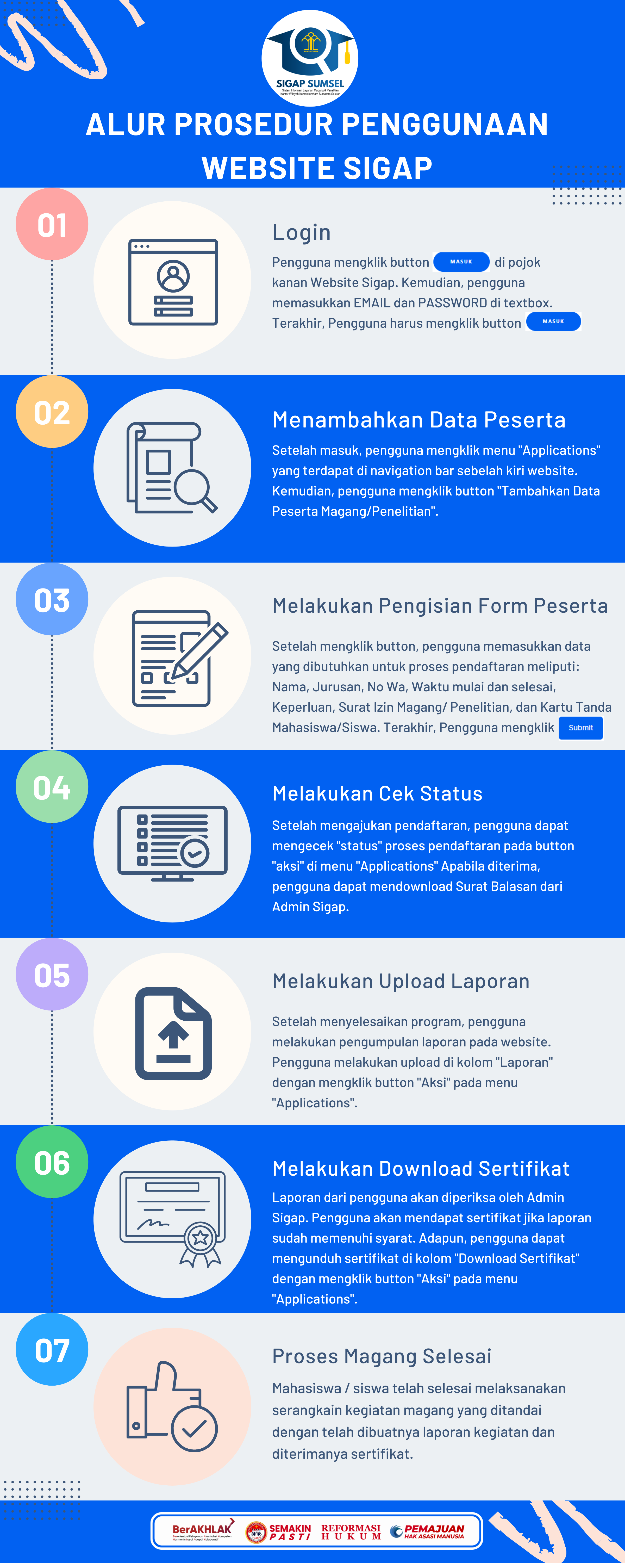 SIGAP-SUMSEL merupakan inovasi dan terobosan baru khusunya dalam pengelolaan pelayanan perizinan magang dan penelitian di lingkup Kantor Wilayah Kementerian Hukum dan HAM Sumatera Selatan, Sistem ini memfasilitasi pengguna untuk mengajukan permohonan magang dan penelitian di Lingkungan Kantor Wilayah Kementerian Hukum dan HAM Sumatera Selatan. Demi kelancaran, mohon mengisi data dengan sebenar-benarnya.